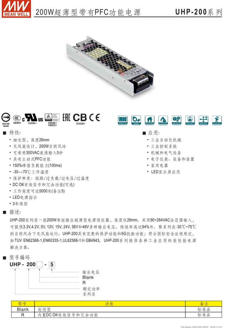UHP-200-3.3 200W 3.3 超薄型带有PFC功能电源 无风扇