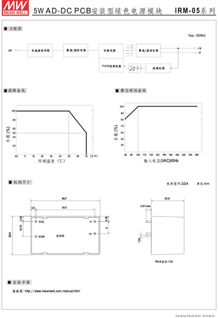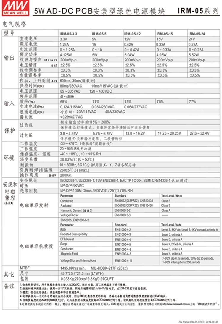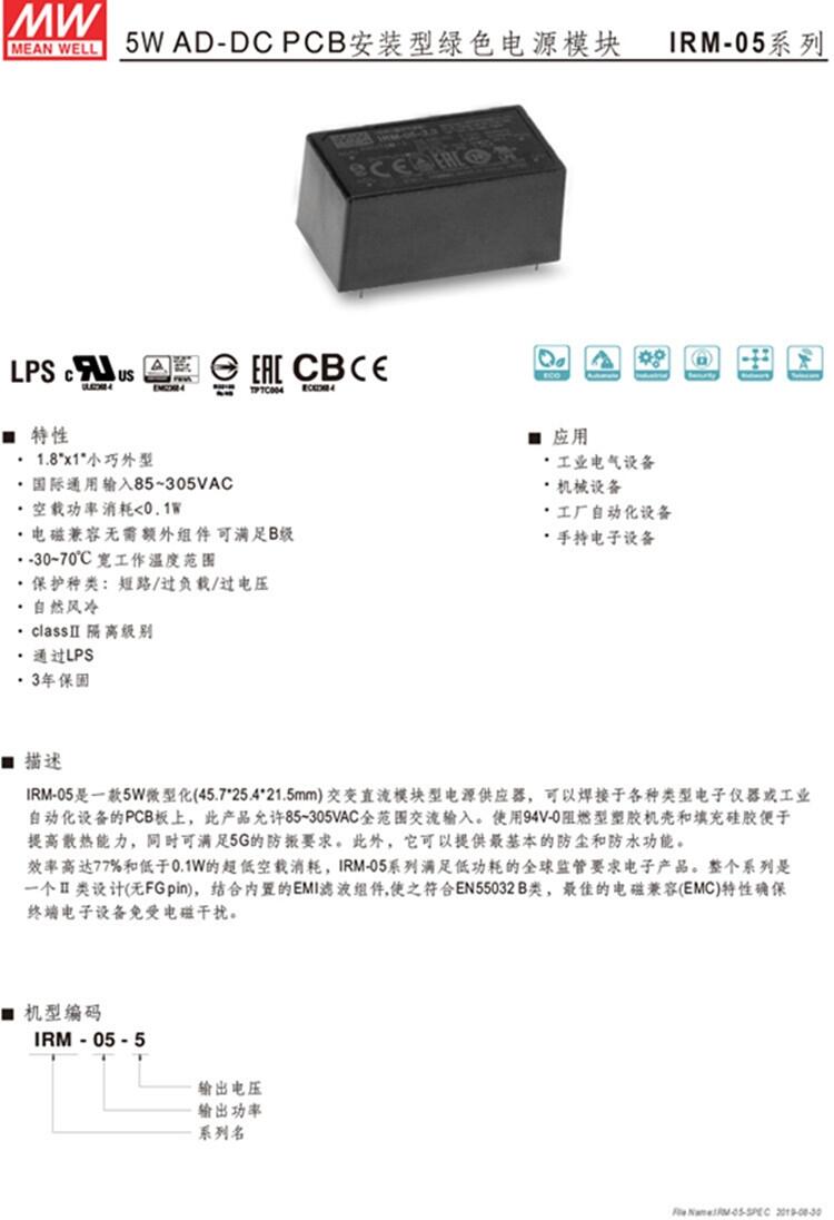 IRM-05-3.3 5W AC-DC PCB安装型绿色电源模块