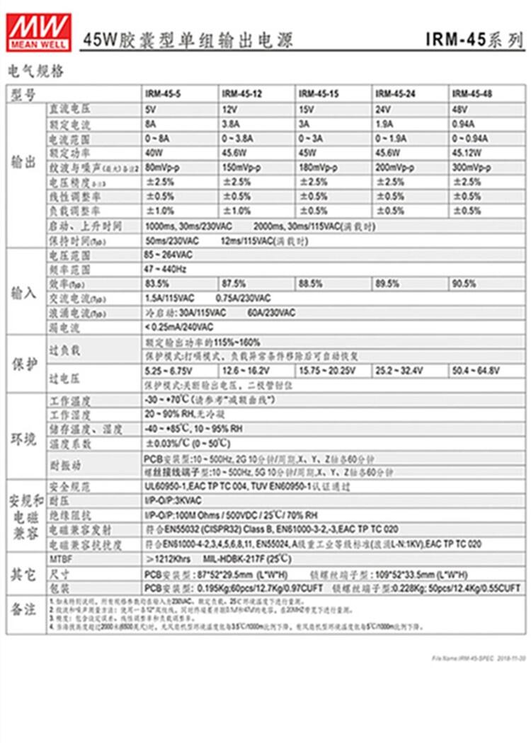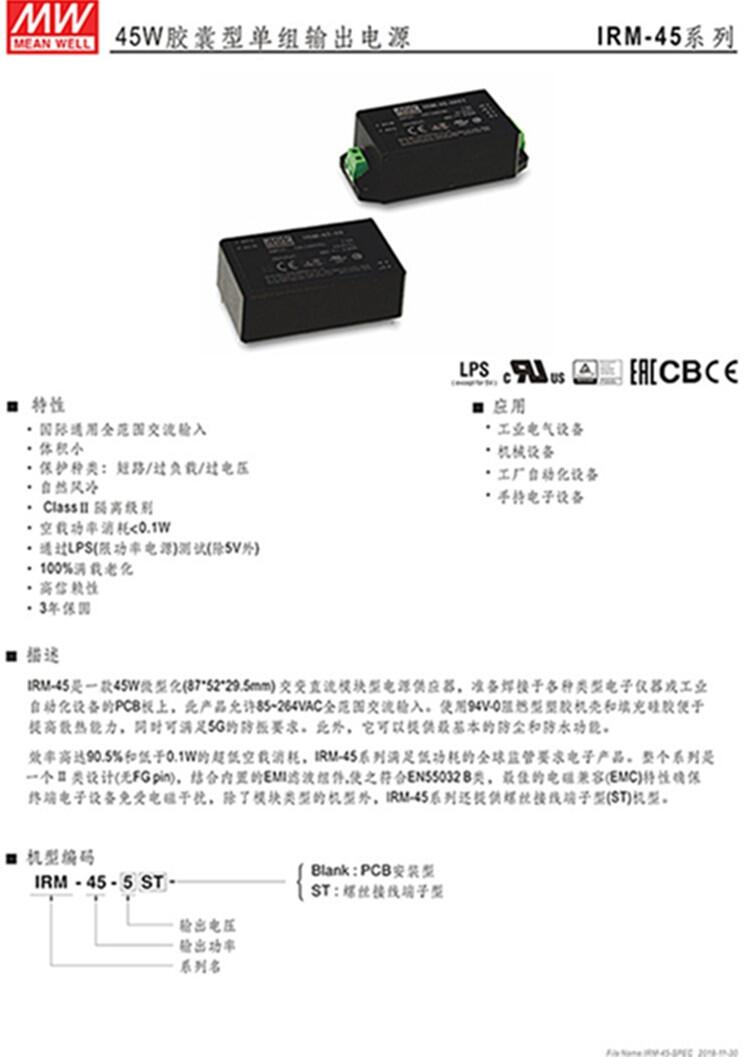 IRM-45-5    45W AC-DC PCB安装型绿色电源模块