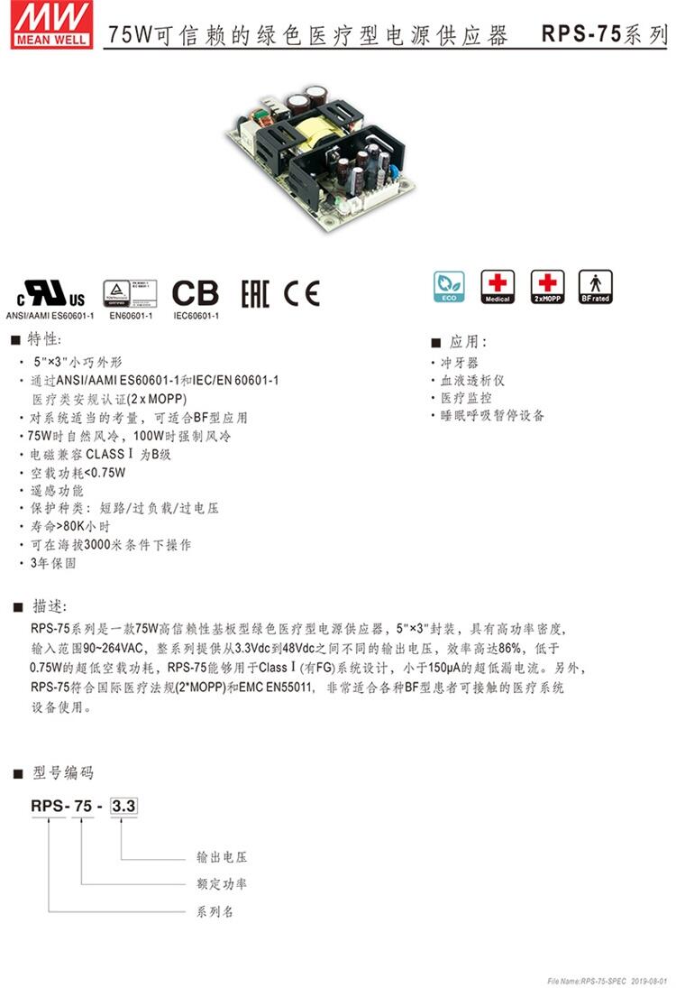 RPS-75-36 75W 可信赖的绿色医疗型电源供应器