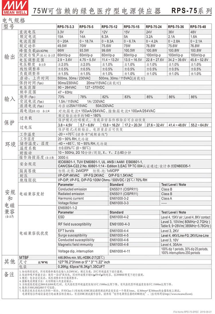RPS-75-36   75W  可信赖的绿色医疗型电源供应器