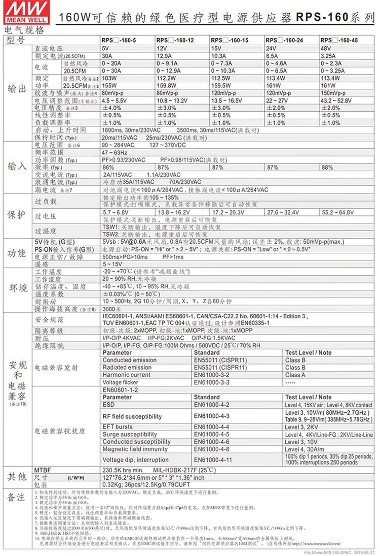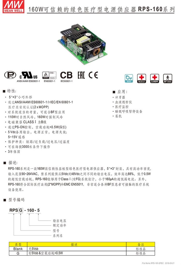 RPS-160-5 160W 5V30 A 可信赖的绿色医疗型电源供应器