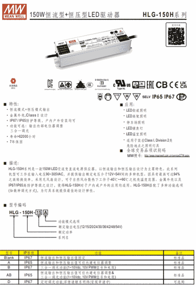 HLG-150H-15  150W 恒流型+恒压型LED驱动器
