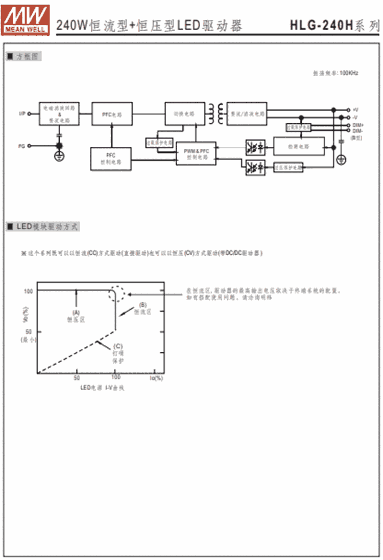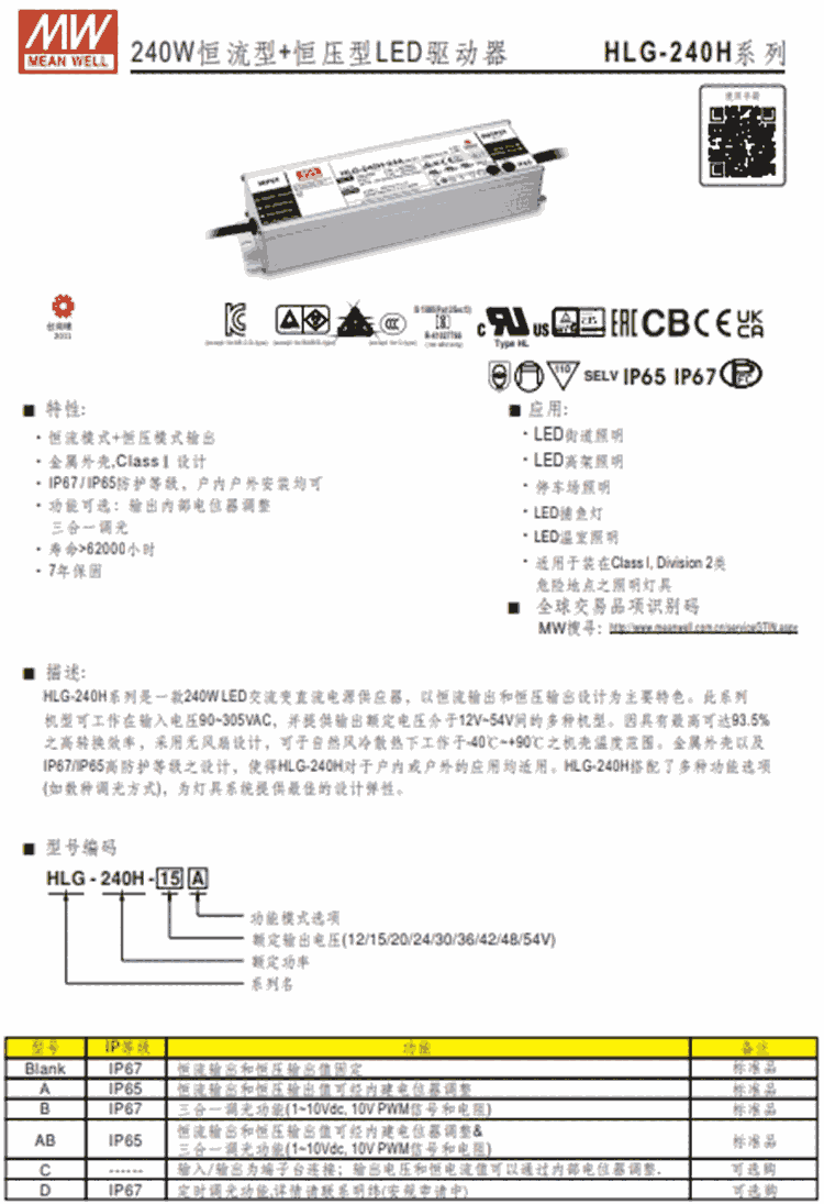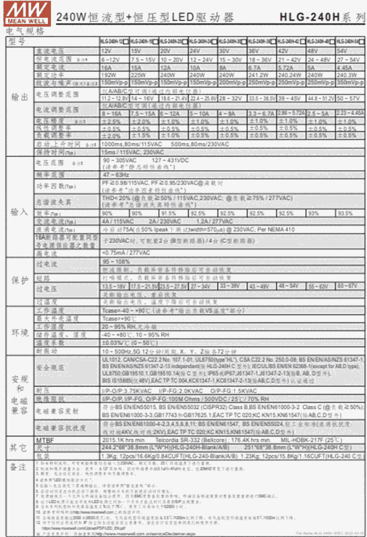 HLG-240H-15 225W 恒流型+恒压型LED驱动器