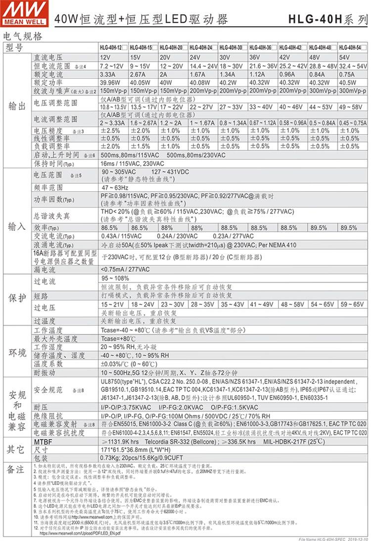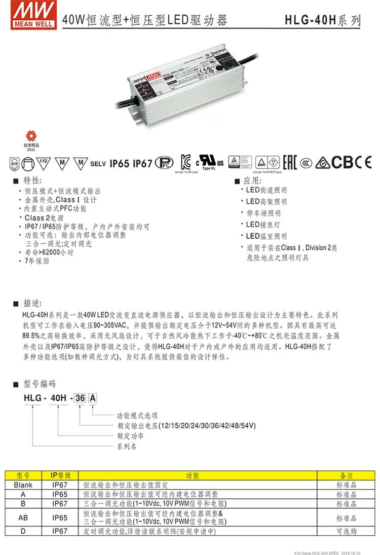 HLG-40H-12B 39.96W恒流型+恒压型LED驱动器
