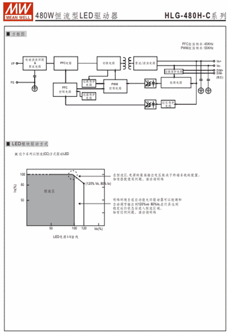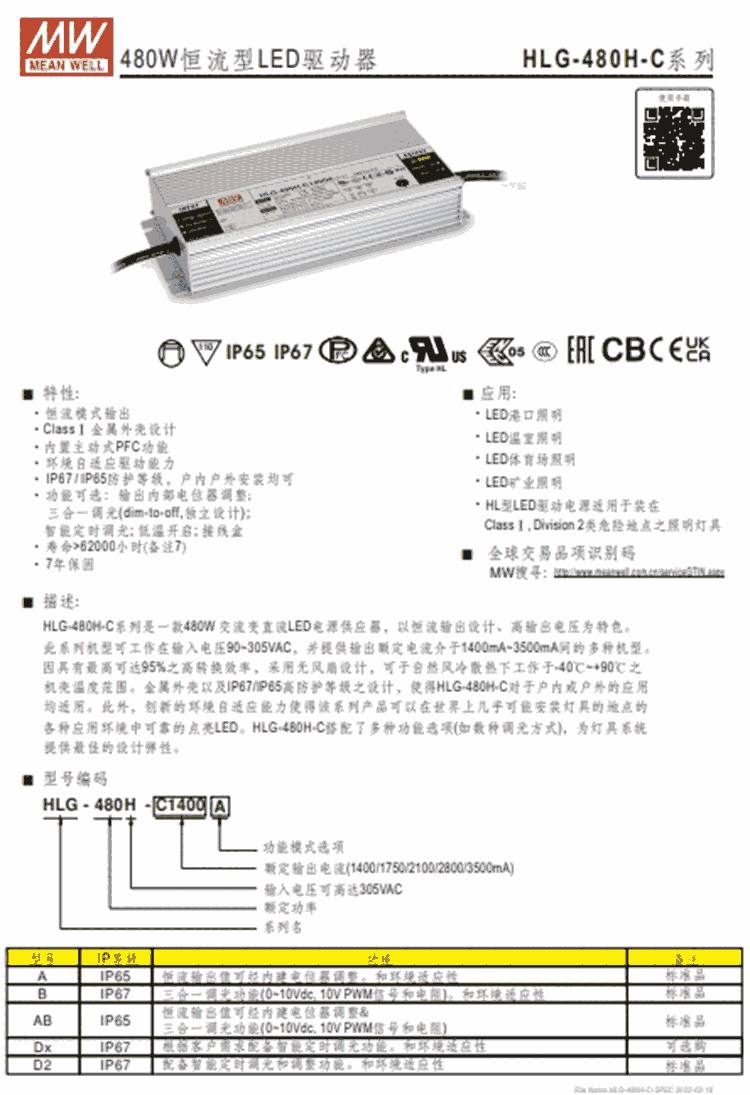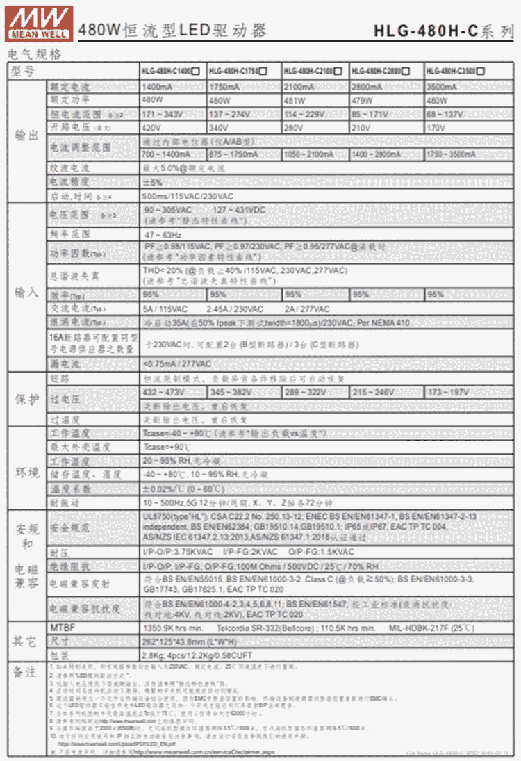 HLG-480H-C2100B 481W恒流型LED驱动器