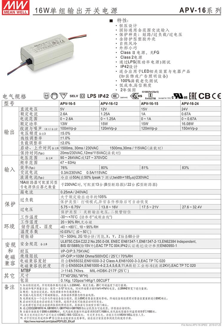 APV-16-24  16.08W 恒压LED照明单组输出开关电源
