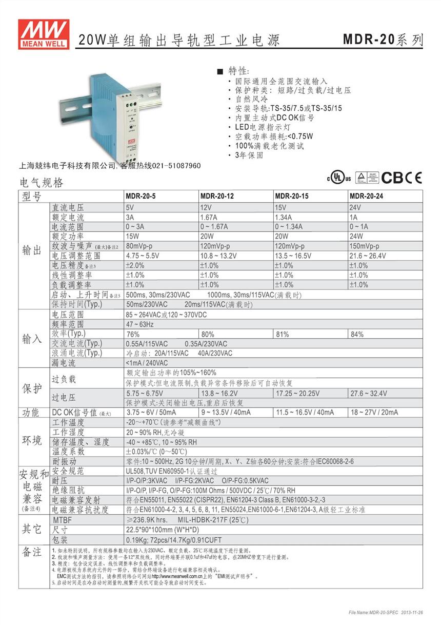 MDR机型为DIN导轨安装电源,安装快捷省力,适合安装于 DIN rail TS35 / 7.5 或 15。是低空载待机损耗机型,内建主动式功率因因素校正功能,有 DC OK讯号输出,方便外接工况显示,100瓦机型还有过热保护功能。